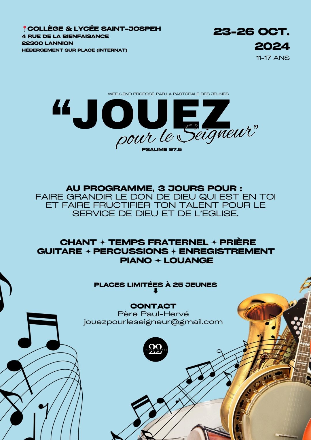 Pour faire grandir et épanouir les talents des jeunes chanteurs et musiciens de nos communautés chrétiennes nous proposons une deuxième édition de la session « Jouez pour le Seigneur » (Ps97,5). Elle sera juste avant la Solennité de la TOUSSAINT. Cette session se déroulera du 23 octobre (18h) au 26 octobre (17h) 2024 à LANNION, […]