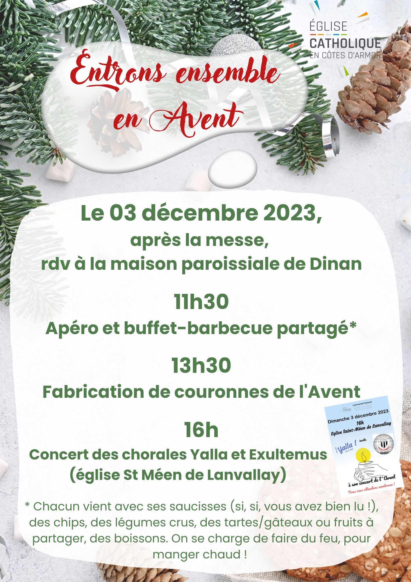 Pour entrer ensemble dans la période de l’Avent, la paroisse de Dinan vous propose de partager une verre et un repas à l’issue de la messe (10h30 à l’église St Malo), à la maison paroissiale. Pour garnir notre table, chacun emmène de quoi partager le repas (grillades, salades, cakes, chips et autres sucreries) et la paroisse se charge de préparer le barbecue (si, si, un vrai barbecue en décembre !) pour manger chaud.